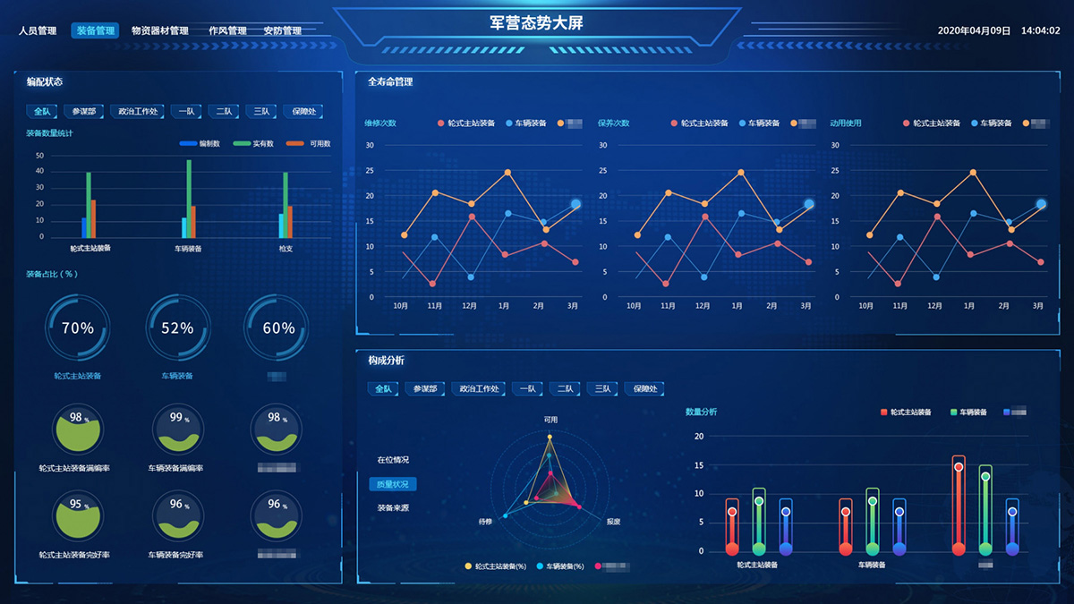 綜合保障系統(tǒng)依托物聯(lián)網(wǎng)、RFID識別和傳感技術(shù),著眼作戰(zhàn)精準保障、戰(zhàn)備常態(tài)保障和官兵生活保障,對戰(zhàn)備物資、裝備器材、營房物資和被裝物資等的全生命周期的電子化管理,對官兵的健康實時監(jiān)護。包含財務(wù)管理、軍需油運、武器裝備、衛(wèi)勤管理、營房管理模塊。確保部隊出動,車輛給養(yǎng)油料跟得上,裝備維護情況實時掌握,營房管理工作平時與戰(zhàn)備同步推進。